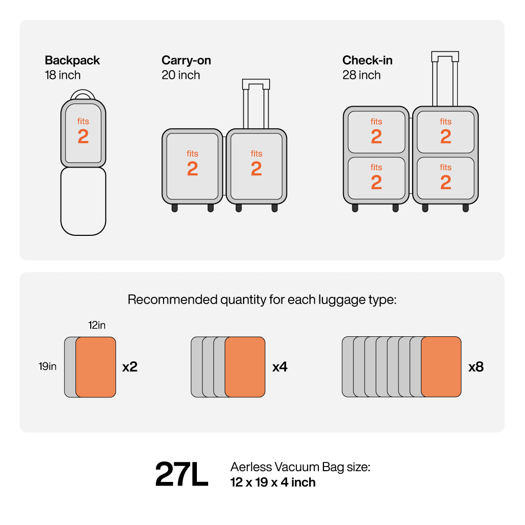 Le Kit de Compression Sous Vide AeroPack™ permet de compresser plus de 15 vêtements et de gagner jusqu’à 60 % d’espace dans n’importe quel sac de voyage — sans bagage en soute.